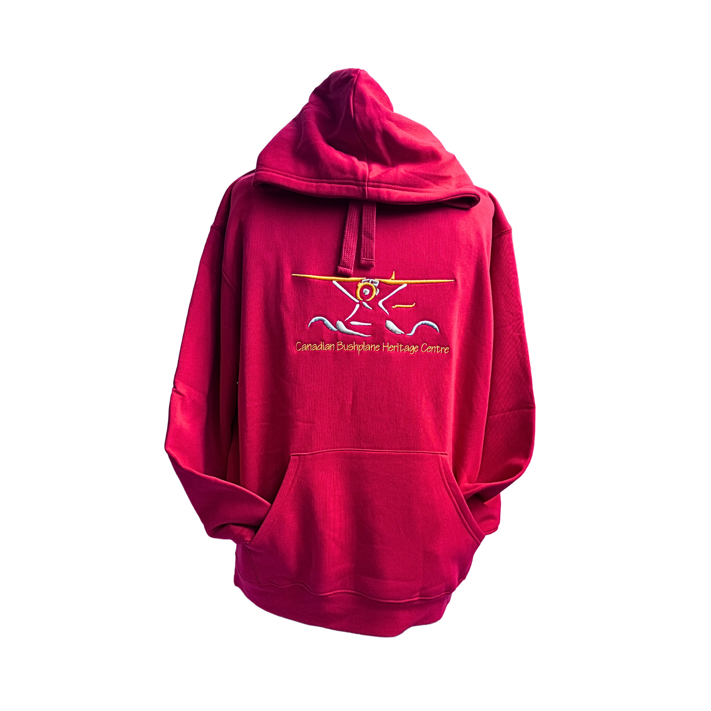 Our embroidered plane emblem on a comfy hooded sweatshirt