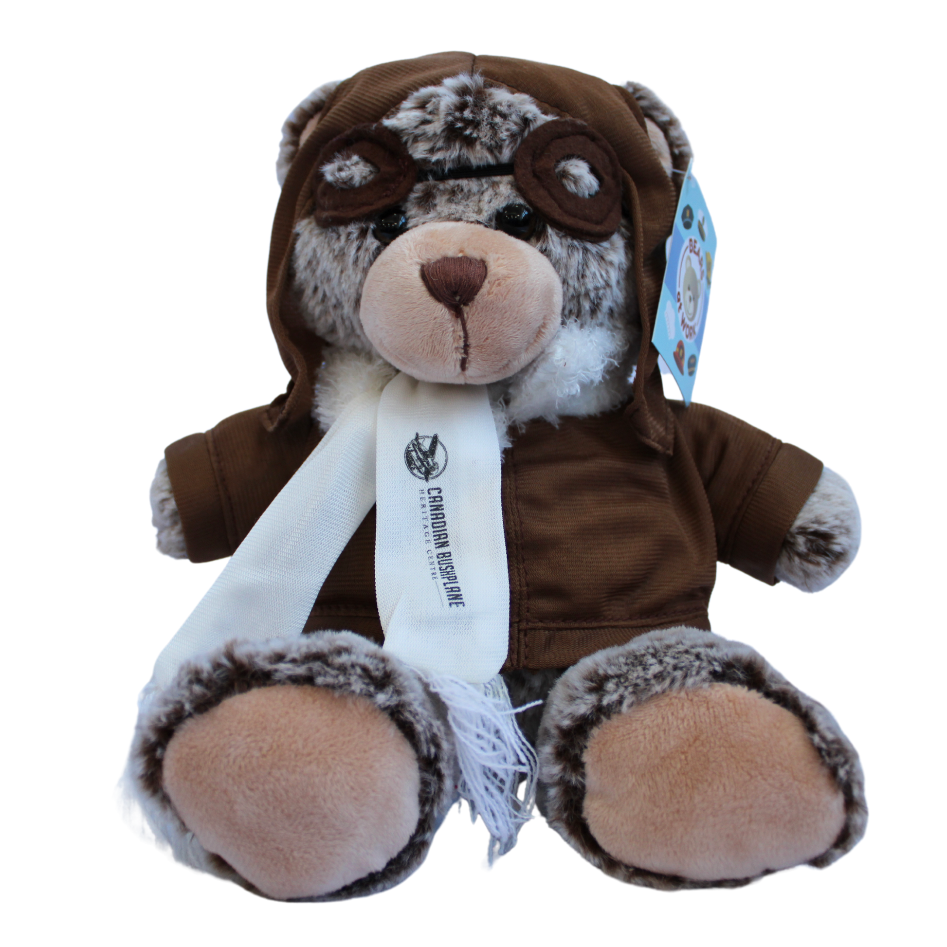 A soft, sweet pilot bear with the Bushplane logo on the scarf