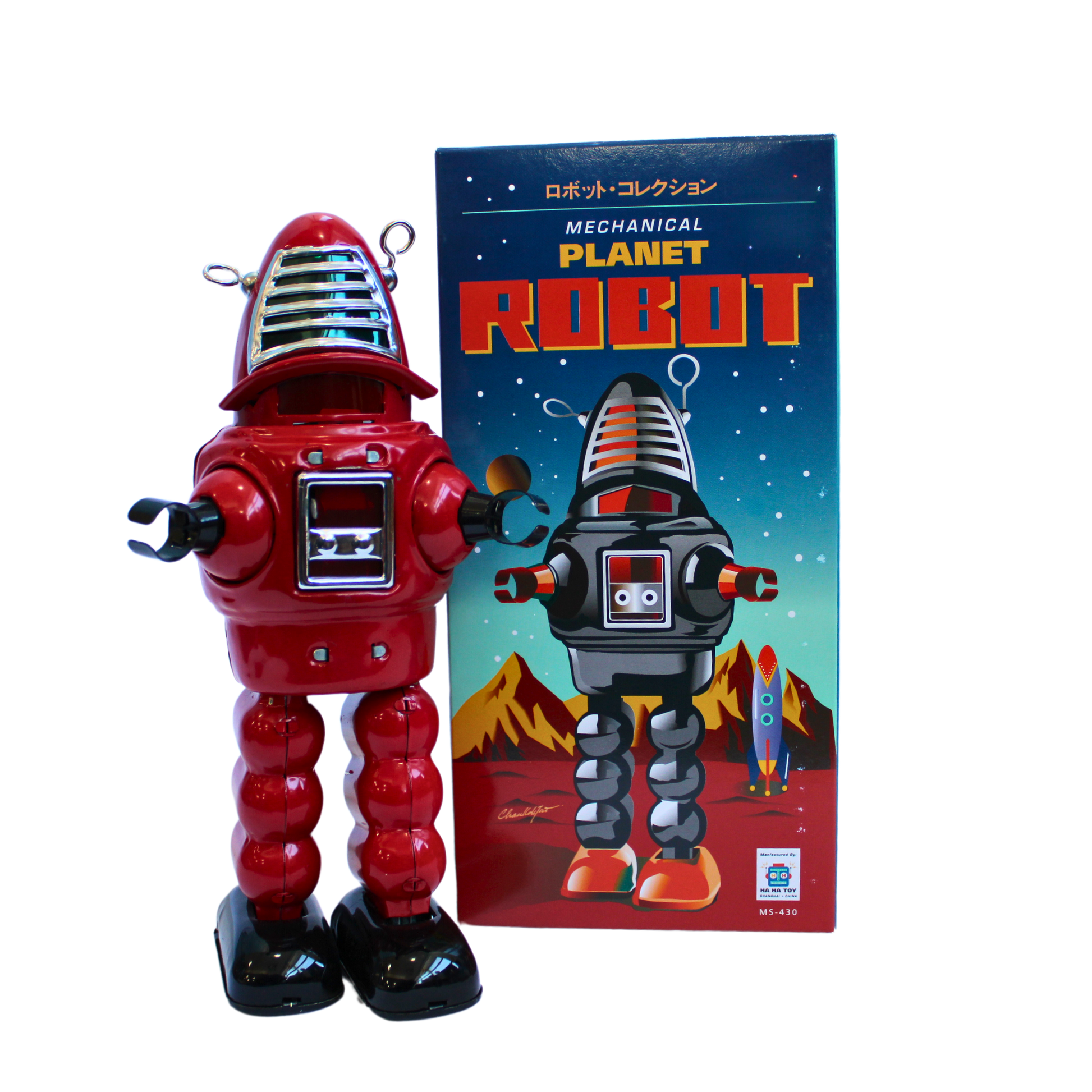 An replica of the 1950’s all-time favorite Robby the Robot, our Planet Robot walks with a sparking action behind his red cello face shield. Complete with fantasy box.