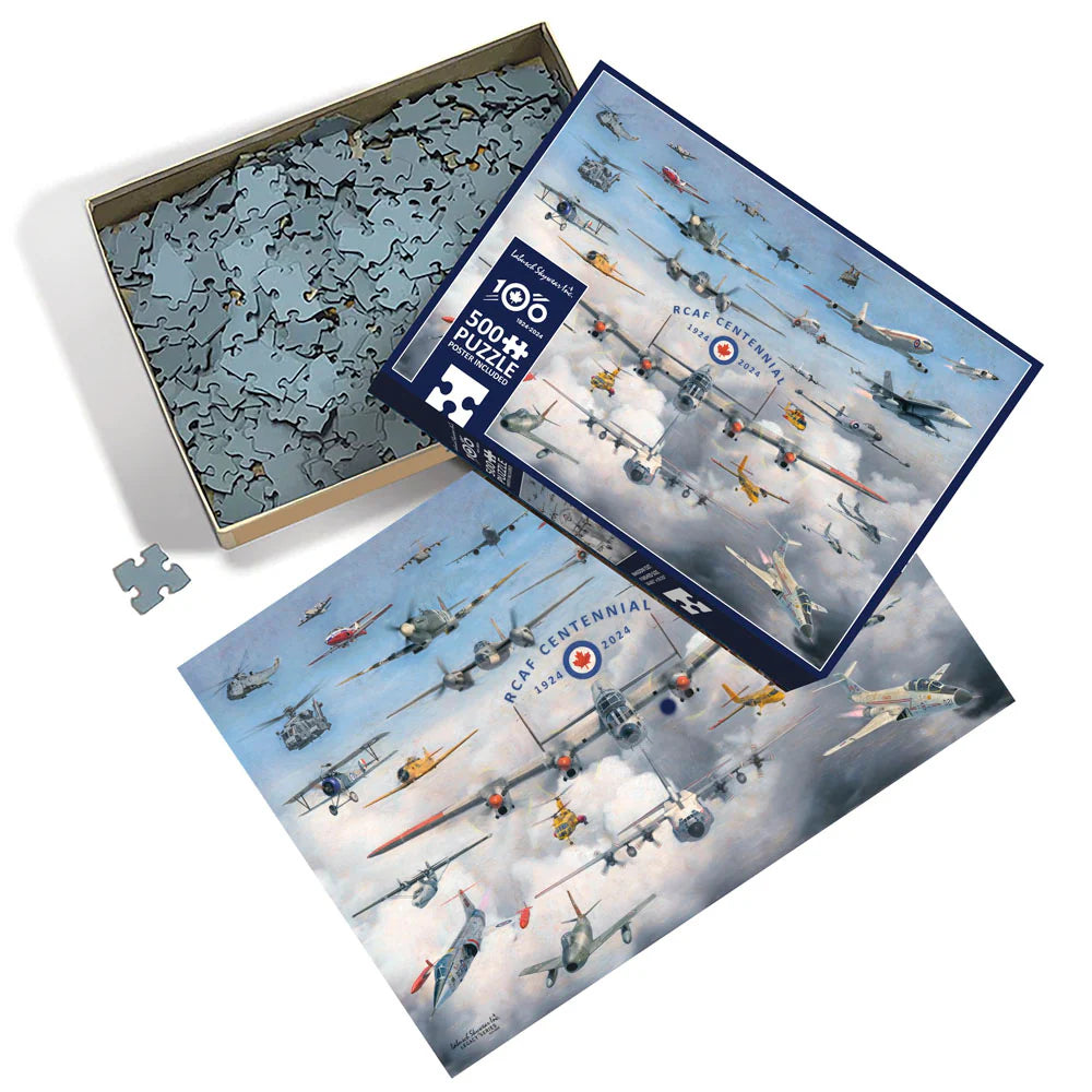 The RCAF 100 Legacy Collage Puzzle is a challenging 500 piece puzzle featuring a historic pictorial retrospective of the aircraft of the RCAF.