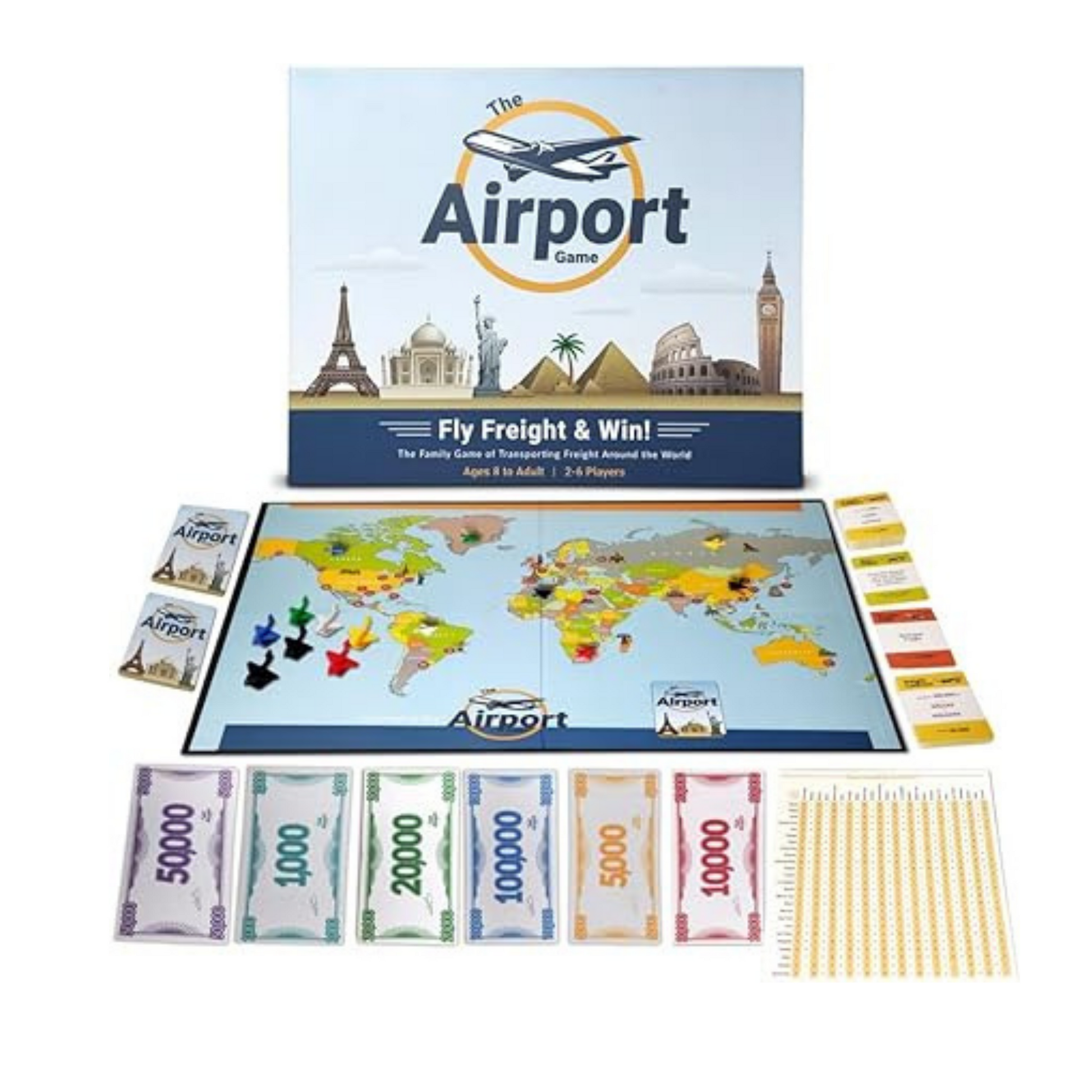 - What's In the Box - The Airport Game includes 1 game board, 6 airplane tokens, 6 dead heading charts, play money, 104 freight contracting cards, 10 penalty cards, 6 free ticket cards.