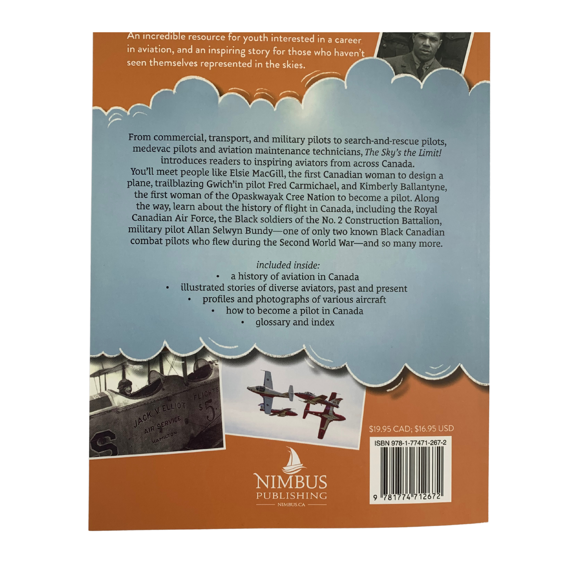 From commercial, transport, and military pilots to search-and-rescue helicopter pilots to airplane mechanics, The Sky's the Limit! introduces readers to inspiring contemporary aviators, including commercial pilot Captain Mohamed Samanter, Gwich'in pilot Fred Carmichael, and Kimberly Ballantyne, the first woman of the Opaskwayak Cree Nation to become a pilot. Along the way, readers will learn important context about the history of flight in Canada, including the Royal Canadian Air Force, the Black soldiers of the No. 2 Construction Battalion, military pilot Allan Selwyn Bundy—one of only two known Black Canadian combat pilots who flew during the Second World War—and many more.